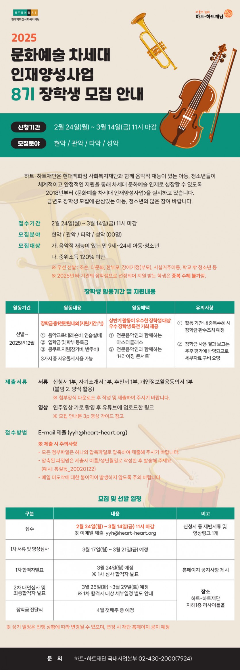 2025년 문화예술 차세대 인재양성사업 8기 장학생 모집 안내 페이지 정보 작성자 하남시장애인가족지원센터 댓글 0건 조회 277회 작성일 25-02-24 09:58 목록 본문 . 이전글하트-하트 아트앤컬쳐 발달장애 미술 작가 모집 25.02.24 다음글[구인 정보] 건물청소(미화) 25.02.18 댓글 0 댓글목록 등록된 댓글이 없습니다.