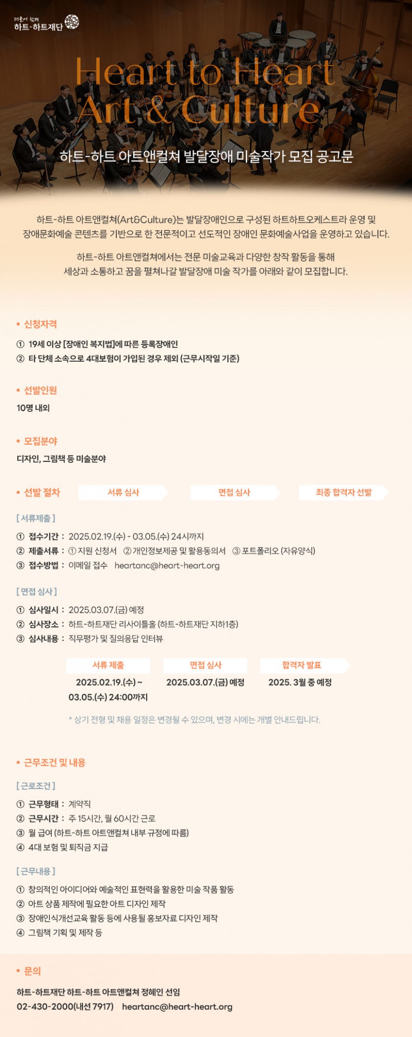 하트-하트 아트앤컬쳐 발달장애 미술 작가 모집 페이지 정보 작성자 하남시장애인가족지원센터 댓글 0건 조회 324회 작성일 25-02-24 09:58 목록 본문 . 이전글65세 이상 발달장애인도 주간활동서비스 이용 가능 25.02.25 다음글2025년 문화예술 차세대 인재양성사업 8기 장학생 모집 안내 25.02.24 댓글 0 댓글목록 등록된 댓글이 없습니다.