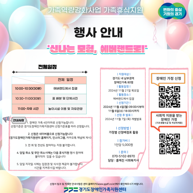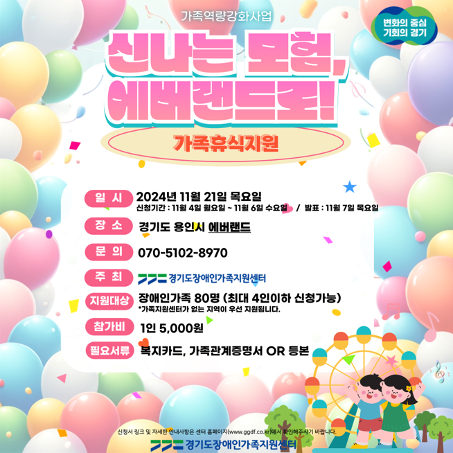 [홍보] 가족역량강화사업 가족휴식지원 '신나는 모험, 에버랜드로' 페이지 정보 작성자 하남시장애인가족지원센터 댓글 0건 조회 479회 작성일 24-11-08 10:10 목록 본문 . 이전글[홍보] 2024년 장애인식개선캠페인 드림패럴림픽 모집 안내 24.11.08 다음글장애인 개인예산제, 실효성은 글쎄? 24.10.08 댓글 0 댓글목록 등록된 댓글이 없습니다.