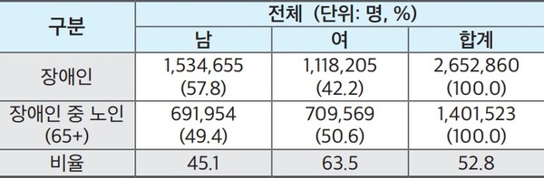 보건복지부가 발표한 2023년 장애인구 현황에 따르면 만65세 이상 장애인은 53.9%로 나타났다. 인구의 20%가 만 65세 이상일 때 초고령 사회라고 하는데 장애인구는 이미 초고령 사회로 넘어선지 오래됐다.