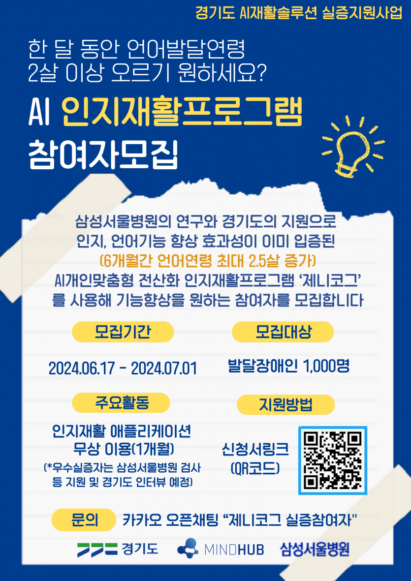 실증참여기관으로 경기도(AI재활솔루션 실증지원사업) 지원, 삼성서울병원이 임상연구 평가를 지원하며 마인드허브는 이미 인지, 언어 기능 향상 효과성이 검증된 AI 인지언어재활 애플리케이션 <제니코그>를 공급합니다. ‘제니코그’는 의료전문기관 재활 솔루션을 가정용으로 개발하여, 간편하게 앱 설치를 통해 개인 맞춤형 훈련을 제공 받을 수 있는 서비스입니다.