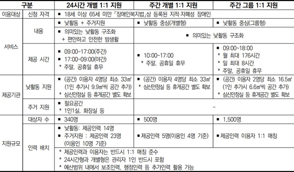 최중증 발달장애인 통합돌봄사업은 돌봄 사각지대에 놓여 있는 최중증 발달장애인을 대상으로 파악된 욕구 및 지원 필요도에 따라 통합적・맞춤형 서비스를 제공하는 것으로 낮활동과 주거지원의 ‘24시간 개별 1:1 지원’, 개별형 낮활동 중심의 ‘주간 개별 1:1 지원’, 그룹형 낮활동 중심의 ‘주간 그룹 1:1 지원’으로 구성됐다.