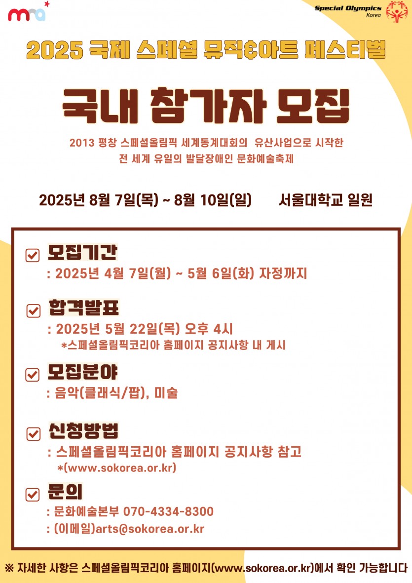스페셜올림픽코리아에서 발달장애인 국제문화예술축제인 <2025 국제 스페셜 뮤직&아트 페스티벌>에 음악과 미술을 사랑하는 발달장애 아티스트를 모집합니다.