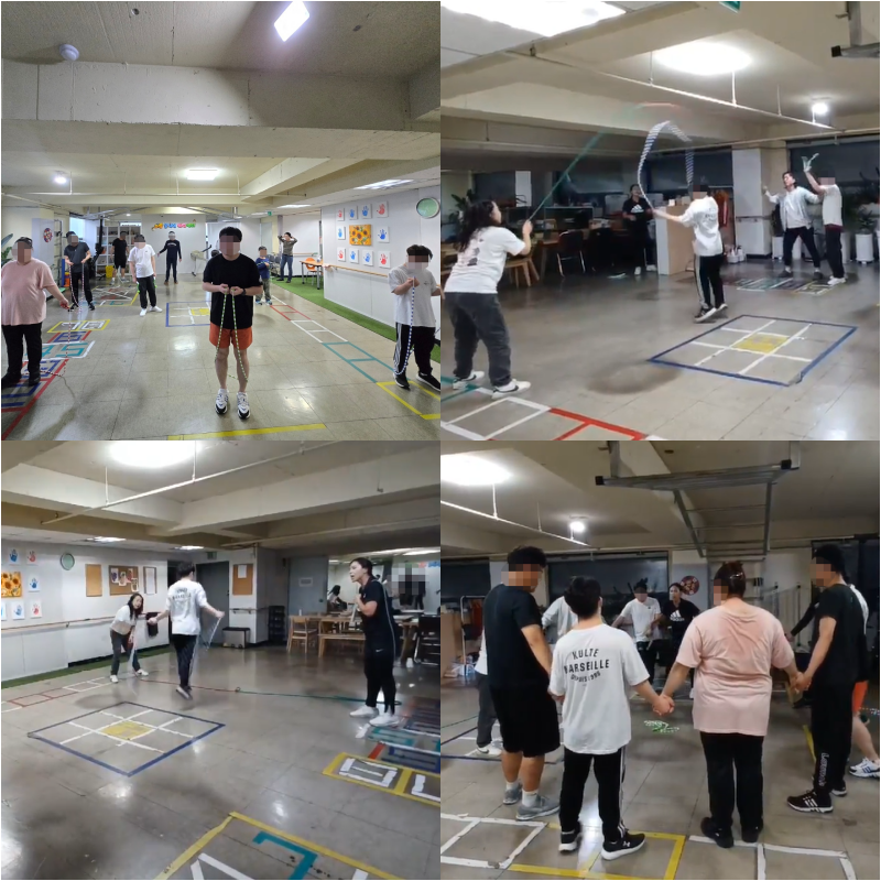 - 단체줄넘기(긴 줄넘기)를 시작할때는 이용자들이 줄 간격을 맞추어 한명씩 들어갔다 빠져나오는 연습을 진행함,