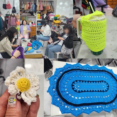 지난 시간에 정했던 작품 - 손가방, 텀블러 가방, 쇼파 혹은 테이블 덮개, 어깨 숄, 여름 모자 등을 손뜨개 작업하는 시간을 가졌습니다.