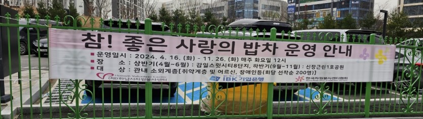 하남시 자원봉사센터와 기업은행, 한국자원봉사센터협회가 함께하는 "참! 좋은 사랑의 밥차" 운영이 2024년 4월 16일(화)부터 11월 26일(화)까지 매주 화요일 12시부터 감일스윗시티8단지(4월~6월), 신장근린1공원(9월~11월)에서 운영된다. 대상은 관내 소외계층(취약계층 및 어르신, 장애인 등)으로 회당 선착순 200명에게 제공한다.