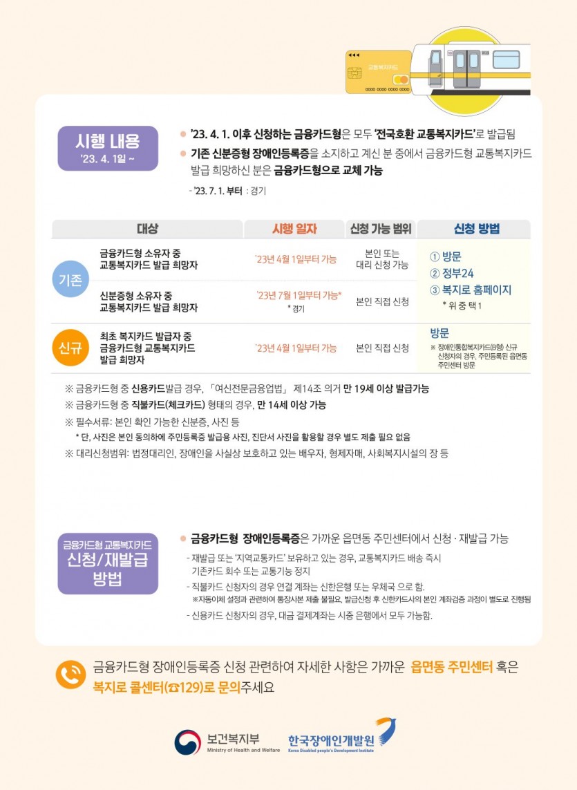 ○ 내용: 2023.04.1 이후 신청하는 금융카드형 복지카드는 "전국호환 교통복지카드"로 발급
