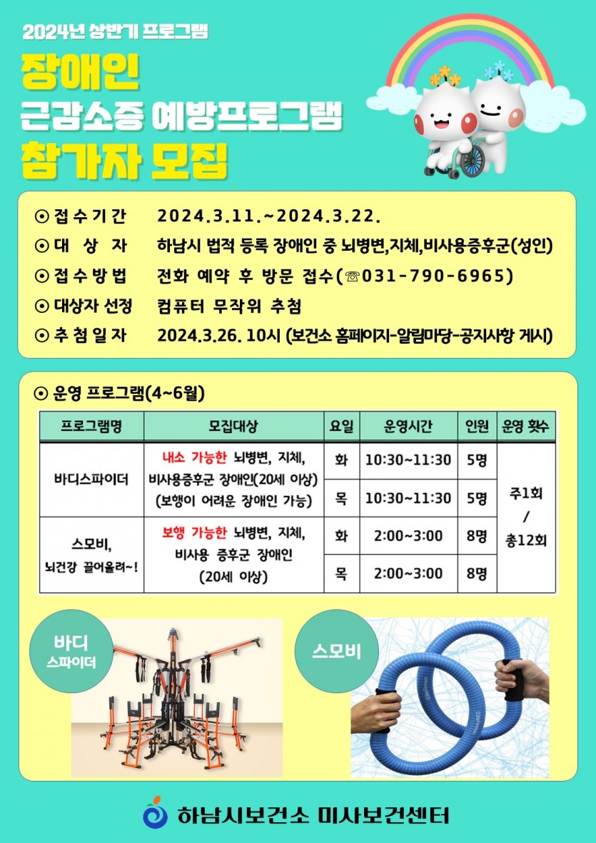 한편, 프로그램 참여 신청은 이달 11일부터 22일까지 재활운동실에 전화 예약 후 방문 접수하며, 자세한 사항은 하남시 미사보건센터 재활운동실(☎ 031-790-6965)로 문의하면 된다.