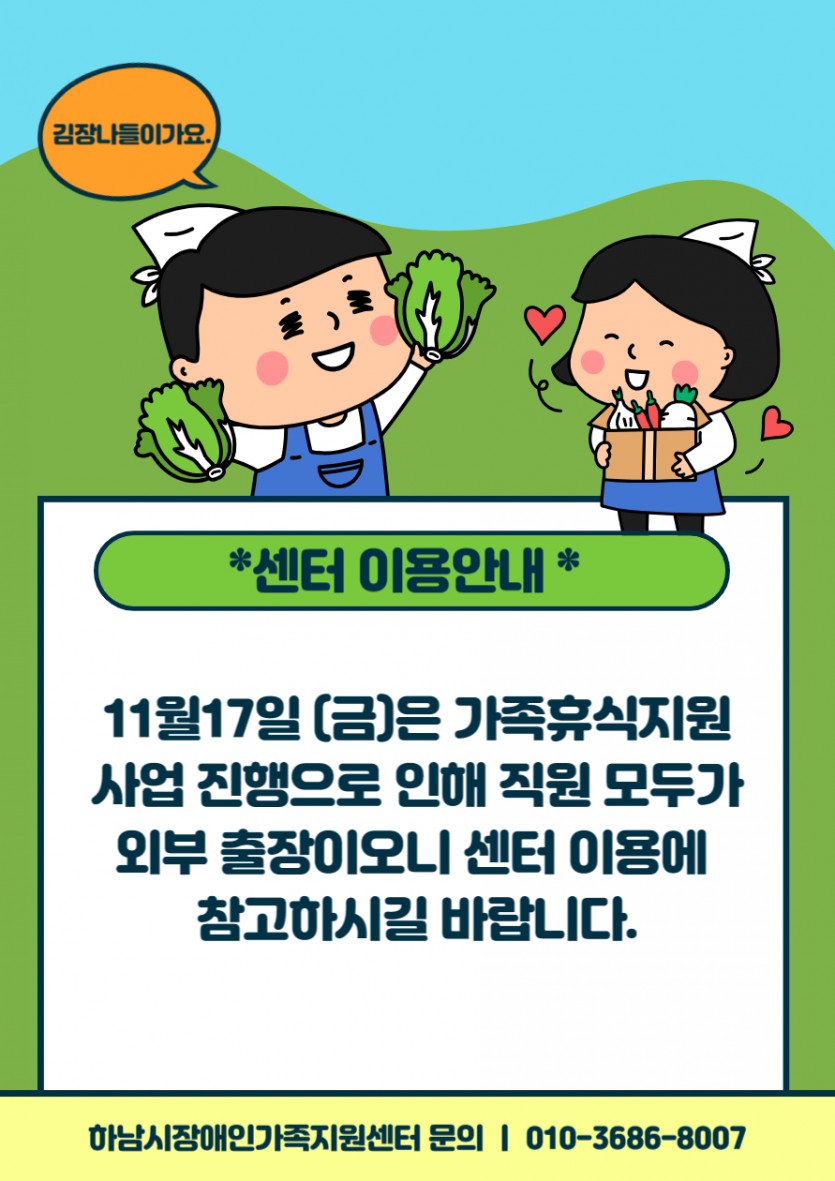 11월 17일 (금) 가족휴식지원사업 진행으로 인해 직원 모두가 외부 출장 이오니 센터 이용에 참고하시길 바랍니다.