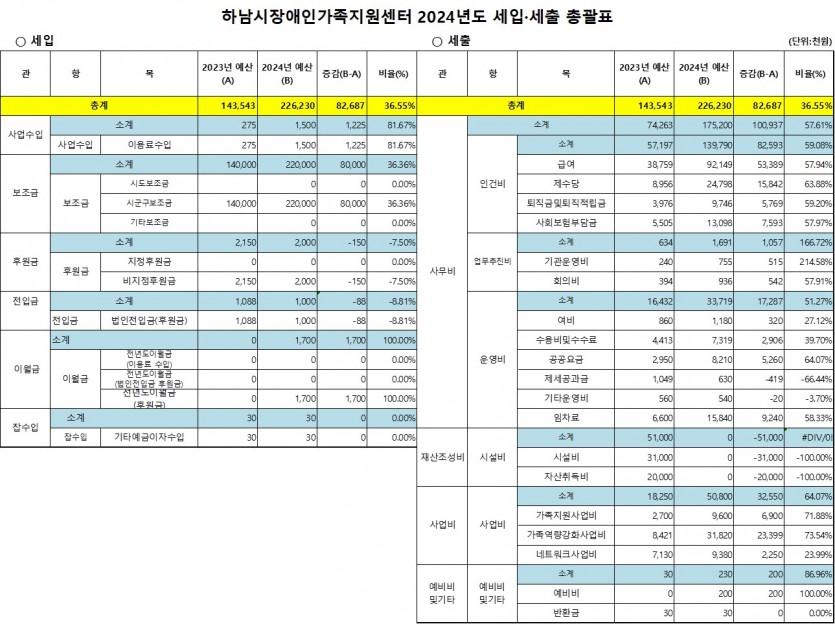 하남시장애인가족지원센터 2024년도 예산 공고 > 공지사항