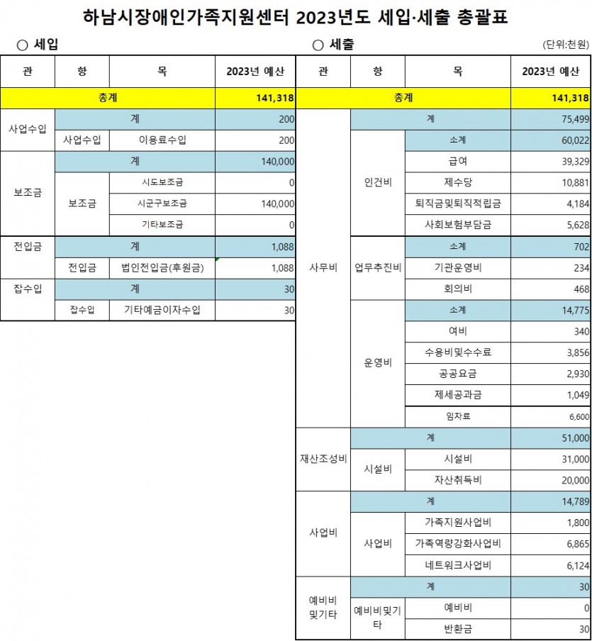 사회복지법인 및 사회복지시설 재무 회계규칙 제10조에 의거하여 붙임과 같이 하남시장애인가족지원센터 2023년 예산을 공고합니다.