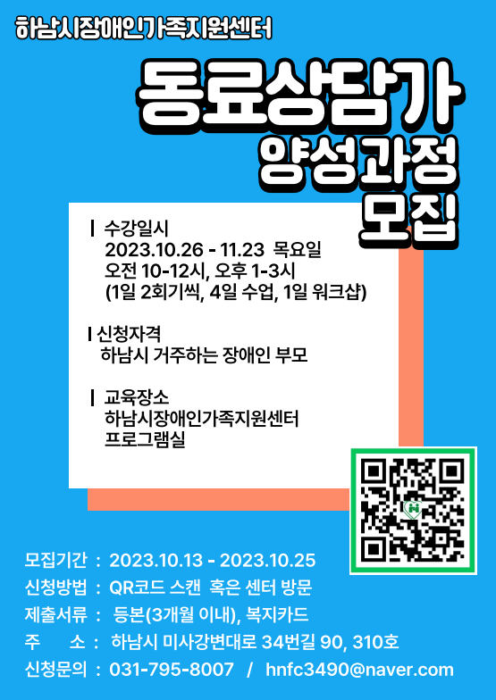 하남시장애인가족지원센터에서 동료상담가 양성과정 모집합니다.