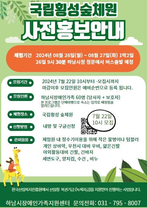 2024년 08월 26일(월)~08월 27일(화) 1박 2일  국립횡성숲체험 이용자 모집 사전 홍보 게시물입니다.