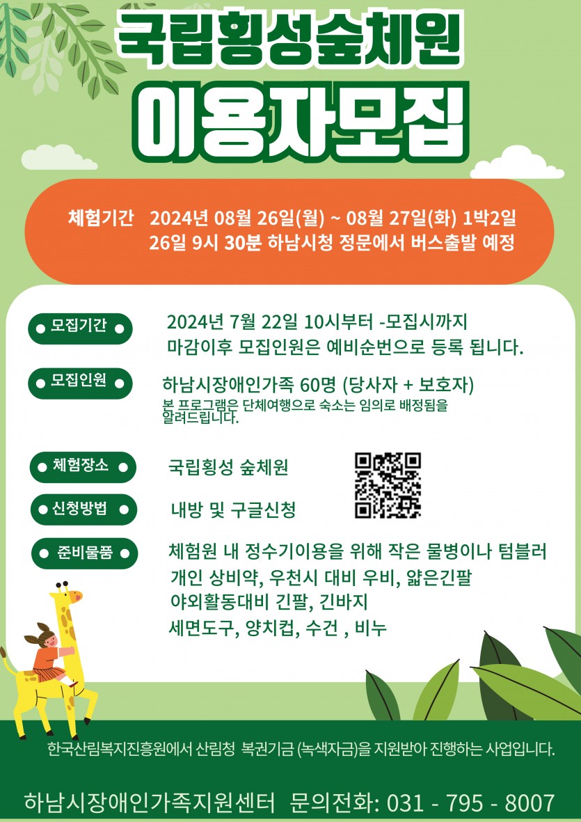 2024년 8월 26일(월) -8월 27일(화) 1박 2일 국립횡성 숲체험 이용자모집 입니다.