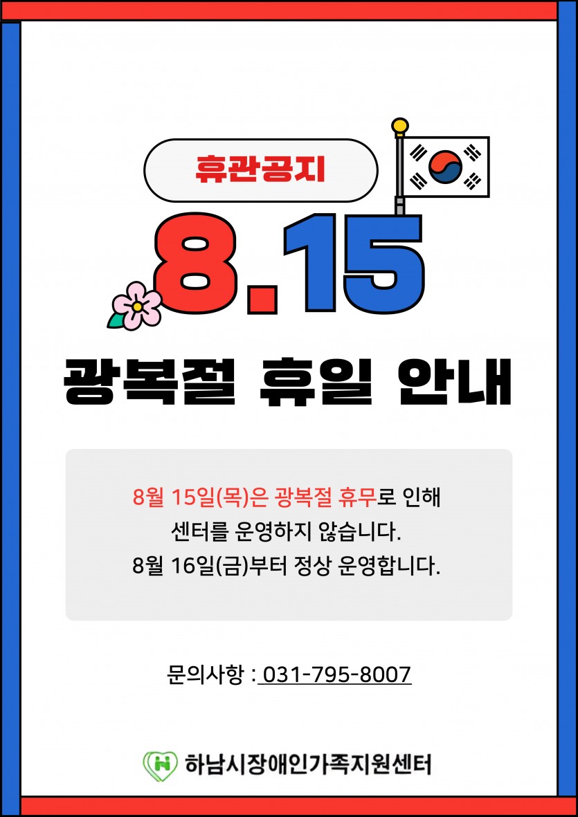 광복절 휴무안내 페이지 정보 작성자 하남시장애인가족지원센터 댓글 0건 조회 707회 작성일 24-08-12 16:03 목록 답변 본문 ** 2024년 8월 15일(목)은 공휴일로 전화상담 및 업무처리가 어려운 점 양해부탁드립니다. ** 이전글[자조모임] 힐링푸드 요리교실 2기 이용신청안내 24.08.14 다음글소식지 vol.1 24.08.12 댓글 0 댓글목록 등록된 댓글이 없습니다.