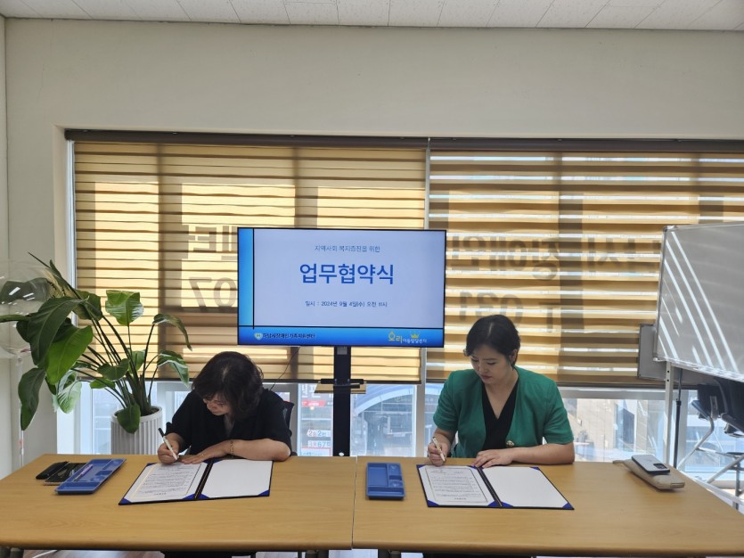 오리아동발달센터 김미주 대표님과 하남시장애인가족지원센터 김말선 센터장님이 하남시장애인가족지원센터 프로그램실에서 업무협약식을 진행하였습니다.
