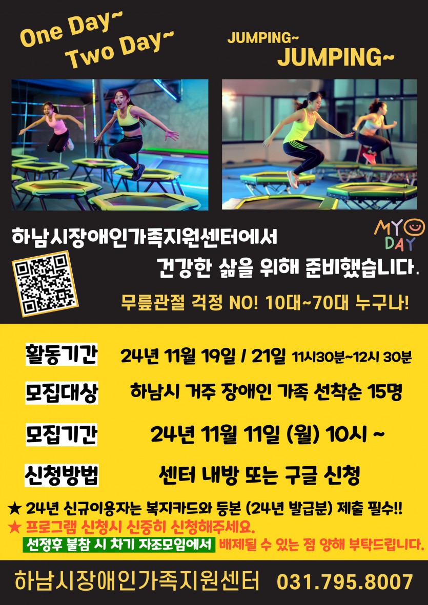 자조모임[원데이1차]Jumping~Jumping~을 통해 나만의 힐링시간을 보내며 지친 삶의 스트레스를 해소하실 장애인가족분들을 모집합니다.