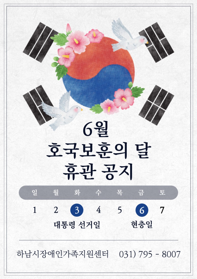 6월 호국보훈의 달 센터 휴관 안내 페이지 정보 작성자 하남시장애인가족지원센터 댓글 0건 조회 203회 작성일 25-06-02 09:26 목록 답변 본문 . 이전글[동료상담] 내담자 모집안내 25.06.04 다음글[가족교육] "성년후견인제도" 사전공지 25.05.28 댓글 0 댓글목록 등록된 댓글이 없습니다.