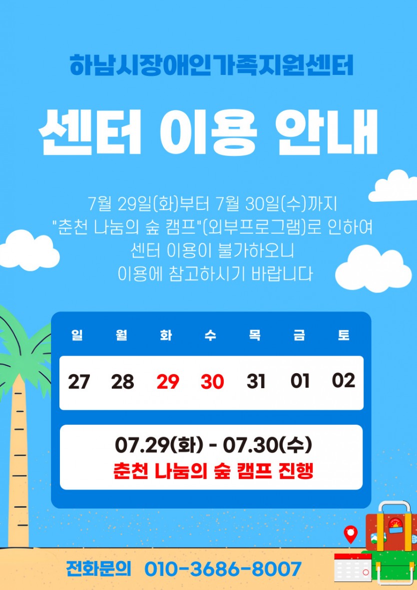 7월 센터 이용 안내 페이지 정보 작성자 하남시장애인가족지원센터 댓글 0건 조회 251회 작성일 25-07-21 10:52 목록 답변 본문 . 이전글[장애비장애통합프로그램] 군대체험 이용자모집 안내 25.08.05 다음글[가족휴식지원] 춘천 "나눔의 숲 캠프" 이용자 확정명단입니다. 25.07.02 댓글 0 댓글목록 등록된 댓글이 없습니다.