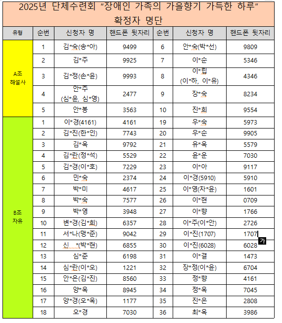[가족휴식지원] 2025년 단체수련회 "장애인 가족의 가을향기 가득한 하루" 이용자 확정명단입니다. > 공지사항