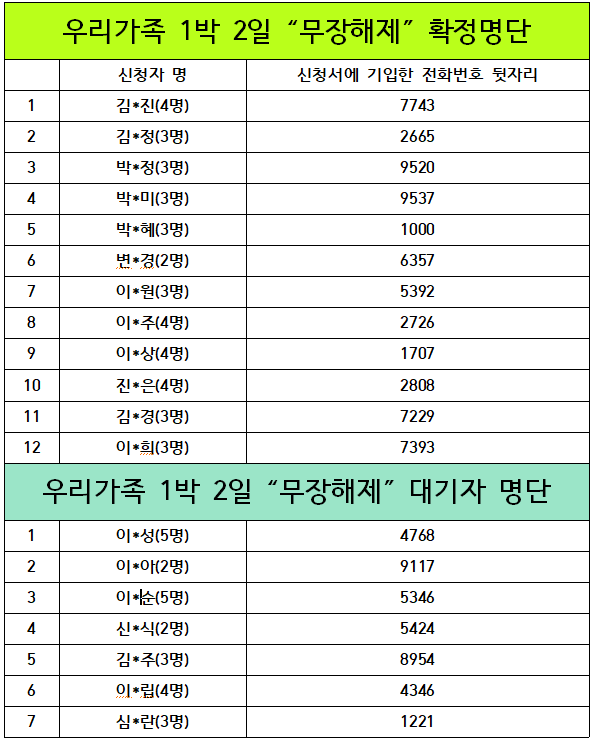 [휴식지원] 우리가족 1박 2일 "무장해제" 이용자 확정명단입니다.